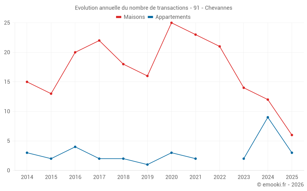Le prix médian sur les 28 transactions de maisons des 24 derniers mois dans la commune de Chevannes était de 3 064 € par mètre carré pour une valeur foncière médiane de 293 500 €. Sur cette période 60% des transactions se sont situées entre 2 294 et 3 594 € par mètre carré (du 2ème au 8ème déciles).
