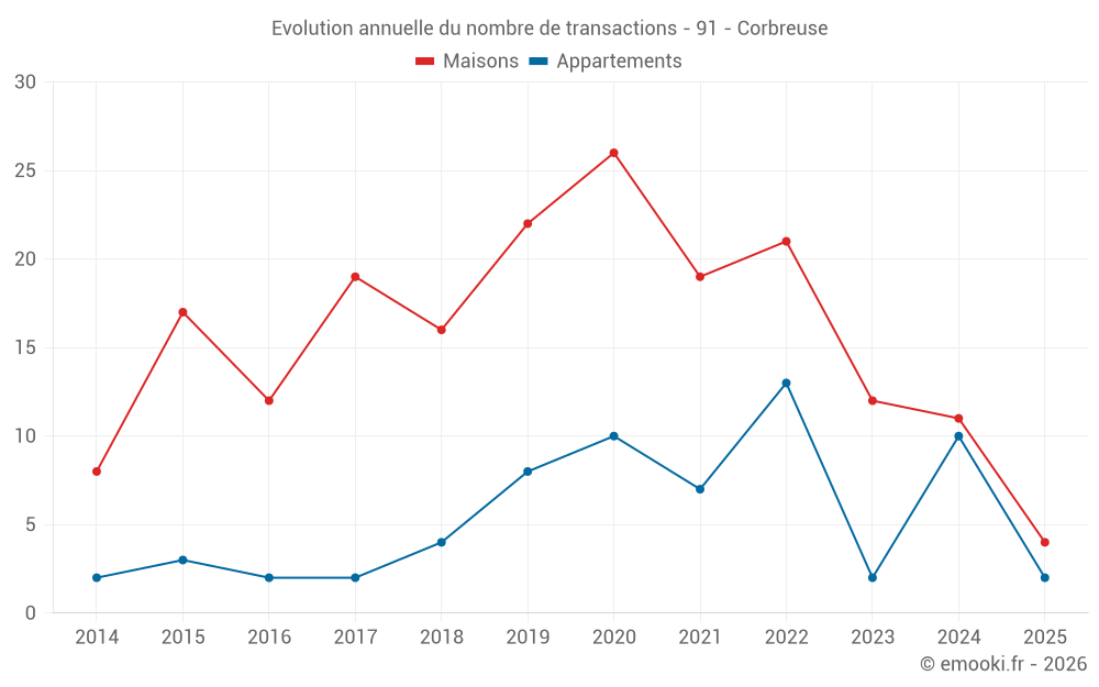 Le prix médian sur les 24 transactions de maisons des 24 derniers mois dans la commune de Corbreuse était de 2 668 € par mètre carré pour une valeur foncière médiane de 251 000 €. Sur cette période 60% des transactions se sont situées entre 2 503 et 3 142 € par mètre carré (du 2ème au 8ème déciles).