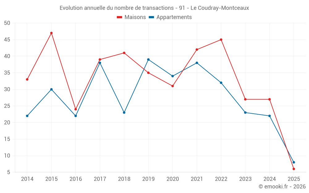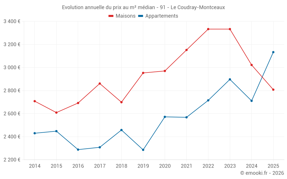 Le prix médian sur les 24 transactions de maisons des 12 derniers mois dans la commune du Coudray-Montceaux était de 3 045 € par mètre carré pour une valeur foncière médiane de 302 500 €. Sur cette période 60% des transactions se sont situées entre 2 526 et 3 437 € par mètre carré (du 2ème au 8ème déciles).