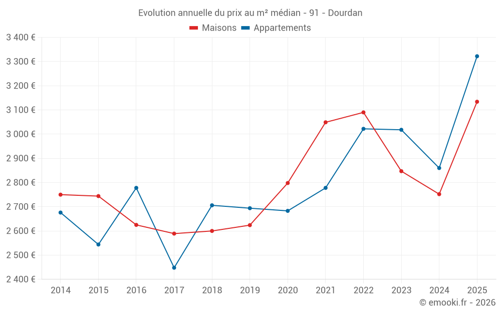 Le prix médian sur les 52 transactions de maisons des 12 derniers mois dans la commune de Dourdan était de 2 922 € par mètre carré pour une valeur foncière médiane de 262 500 €. Sur cette période 60% des transactions se sont situées entre 2 343 et 3 438 € par mètre carré (du 2ème au 8ème déciles).