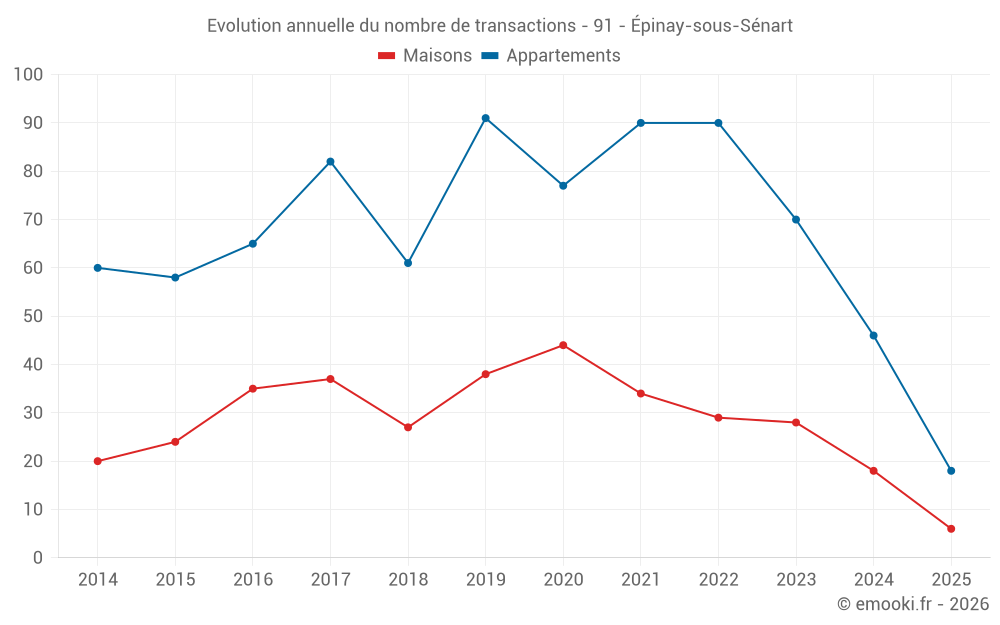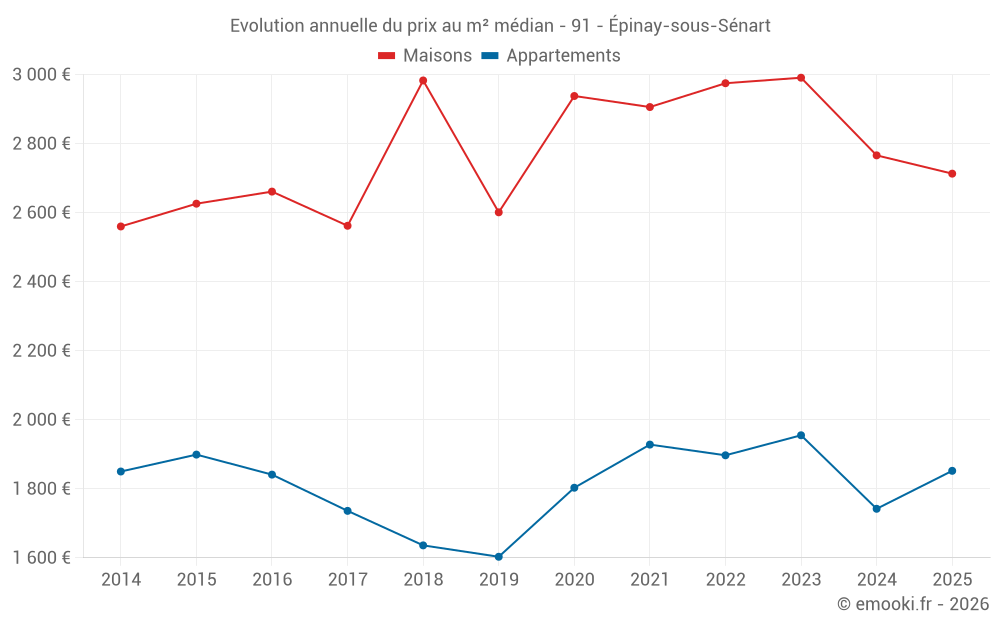 Le prix médian sur les 36 transactions de maisons des 24 derniers mois dans la commune d'Épinay-sous-Sénart était de 2 800 € par mètre carré pour une valeur foncière médiane de 220 000 €. Sur cette période 60% des transactions se sont situées entre 2 391 et 3 301 € par mètre carré (du 2ème au 8ème déciles).