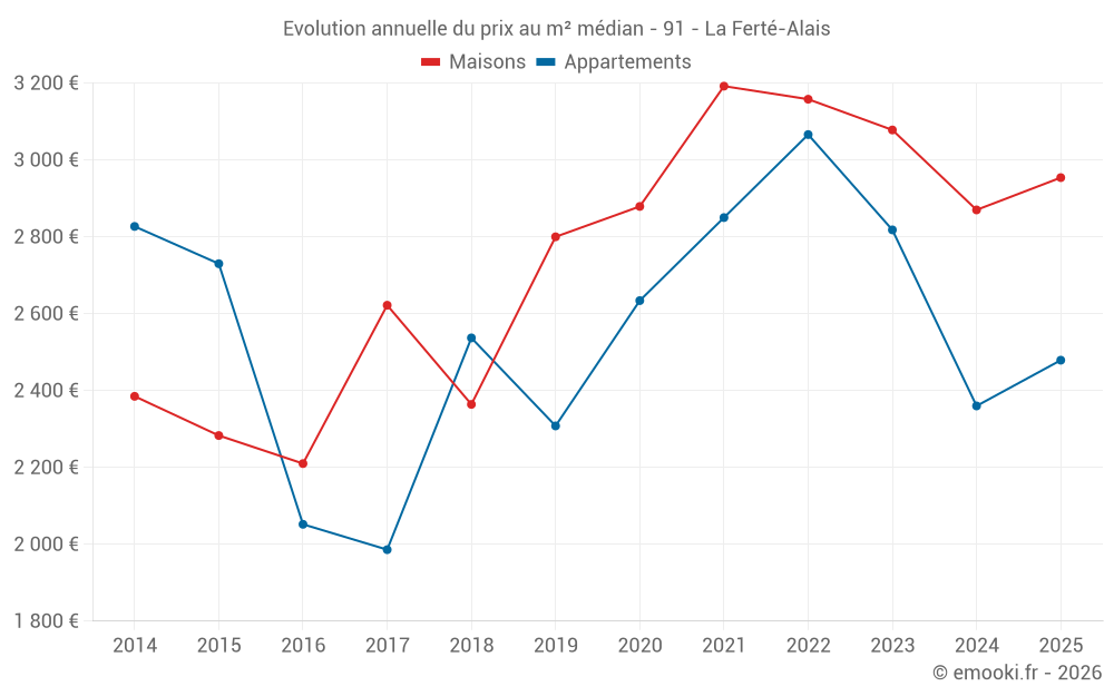 Le prix médian sur les 25 transactions d'appartements des 24 derniers mois dans la commune de la Ferté-Alais était de 2 419 € par mètre carré pour une valeur foncière médiane de 156 000 €. Sur cette période 60% des transactions se sont situées entre 2 093 et 2 825 € par mètre carré (du 2ème au 8ème déciles).