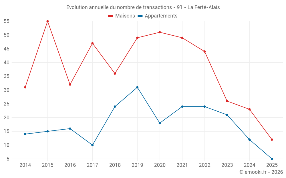 Le prix médian sur les 28 transactions de maisons des 12 derniers mois dans la commune de la Ferté-Alais était de 2 870 € par mètre carré pour une valeur foncière médiane de 286 000 €. Sur cette période 60% des transactions se sont situées entre 2 351 et 3 910 € par mètre carré (du 2ème au 8ème déciles).