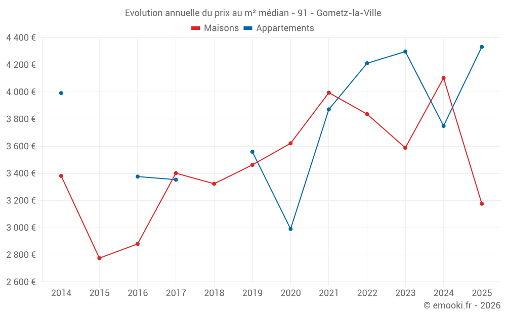 Le prix médian sur les 15 transactions de maisons des 24 derniers mois dans la commune de Gometz-la-Ville était de 3 589 € par mètre carré pour une valeur foncière médiane de 426 800 €. Sur cette période 60% des transactions se sont situées entre 2 786 et 4 142 € par mètre carré (du 2ème au 8ème déciles).