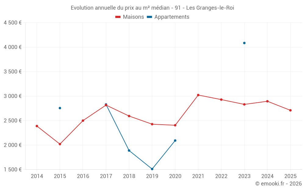 Le prix médian sur les 18 transactions de maisons des 24 derniers mois dans la commune des Granges-le-Roi était de 2 878 € par mètre carré pour une valeur foncière médiane de 295 500 €. Sur cette période 60% des transactions se sont situées entre 2 521 et 3 216 € par mètre carré (du 2ème au 8ème déciles).