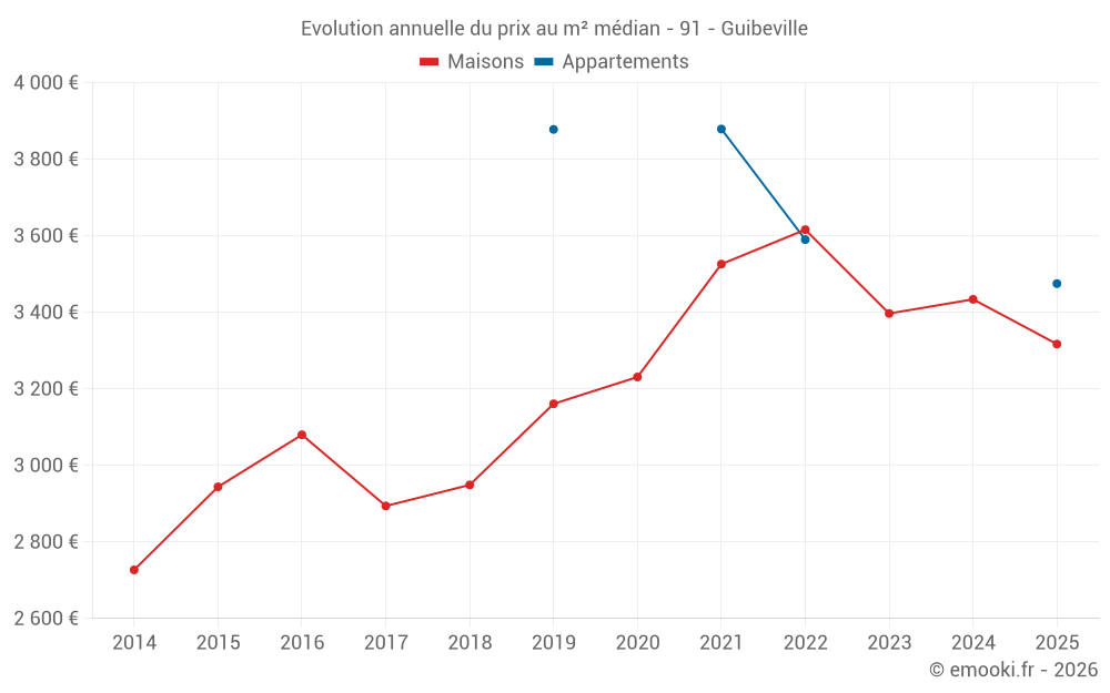 Le prix médian sur les 18 transactions de maisons des 24 derniers mois dans la commune de Guibeville était de 3 397 € par mètre carré pour une valeur foncière médiane de 330 360 €. Sur cette période 60% des transactions se sont situées entre 2 999 et 3 661 € par mètre carré (du 2ème au 8ème déciles).
