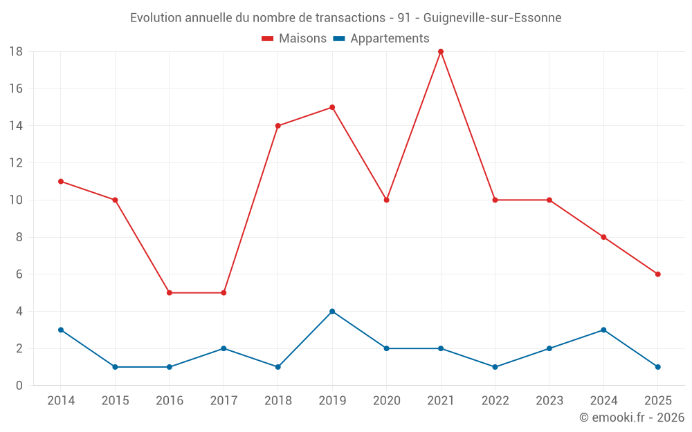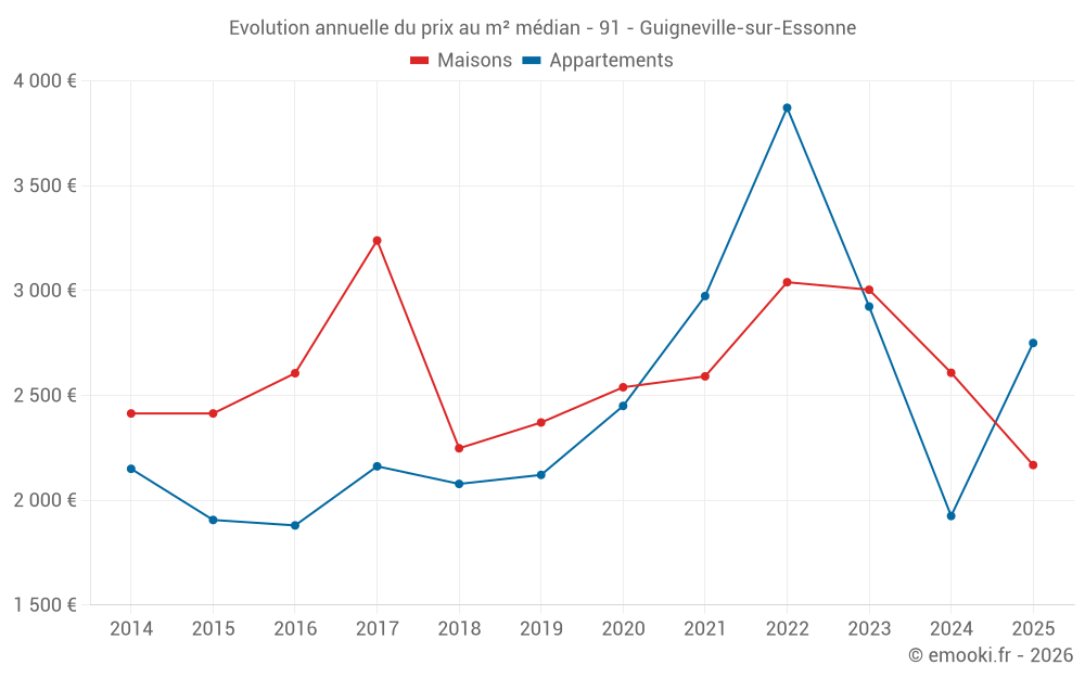 Le prix médian sur les 21 transactions de maisons des 24 derniers mois dans la commune de Guigneville-sur-Essonne était de 2 625 € par mètre carré pour une valeur foncière médiane de 284 200 €. Sur cette période 60% des transactions se sont situées entre 2 268 et 3 024 € par mètre carré (du 2ème au 8ème déciles).