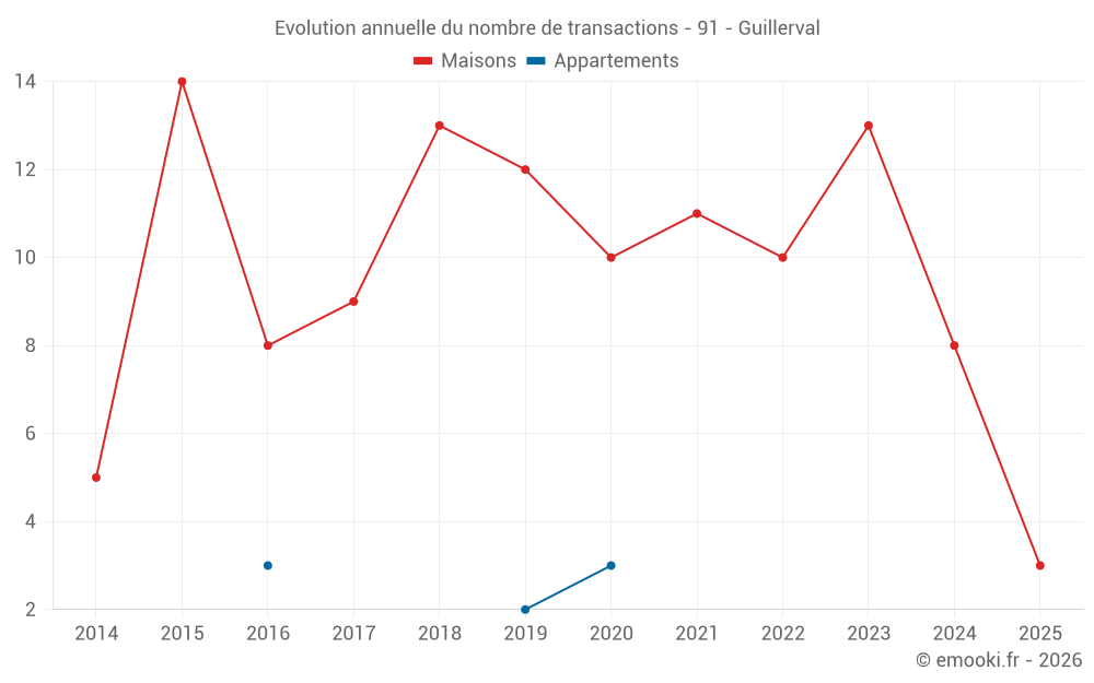 Le prix médian sur les 19 transactions de maisons des 24 derniers mois dans la commune de Guillerval était de 2 623 € par mètre carré pour une valeur foncière médiane de 254 400 €. Sur cette période 60% des transactions se sont situées entre 2 283 et 2 966 € par mètre carré (du 2ème au 8ème déciles).