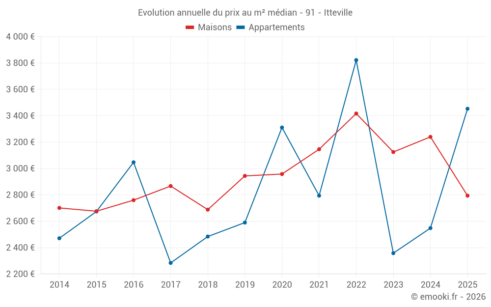 Le prix médian sur les 18 transactions de maisons des 6 derniers mois dans la commune d'Itteville était de 2 794 € par mètre carré pour une valeur foncière médiane de 262 000 €. Sur cette période 60% des transactions se sont situées entre 2 260 et 3 370 € par mètre carré (du 2ème au 8ème déciles).