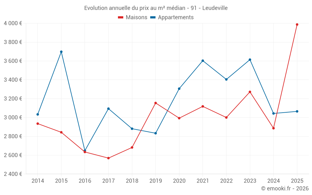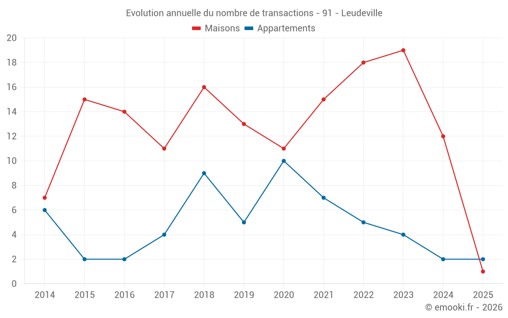 Le prix médian sur les 19 transactions de maisons des 24 derniers mois dans la commune de Leudeville était de 3 125 € par mètre carré pour une valeur foncière médiane de 360 000 €. Sur cette période 60% des transactions se sont situées entre 2 736 et 3 506 € par mètre carré (du 2ème au 8ème déciles).