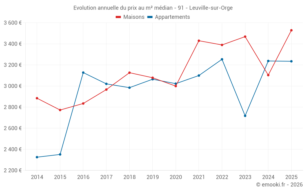 Le prix médian sur les 36 transactions de maisons des 12 derniers mois dans la commune de Leuville-sur-Orge était de 3 247 € par mètre carré pour une valeur foncière médiane de 315 175 €. Sur cette période 60% des transactions se sont situées entre 2 556 et 3 767 € par mètre carré (du 2ème au 8ème déciles).