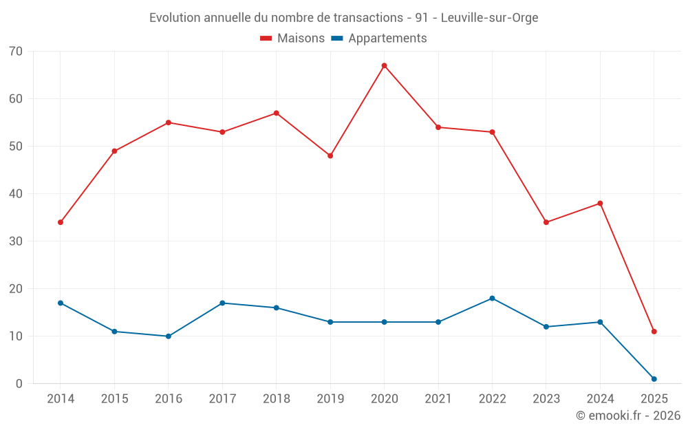 Le prix médian sur les 17 transactions d'appartements des 24 derniers mois dans la commune de Leuville-sur-Orge était de 3 238 € par mètre carré pour une valeur foncière médiane de 162 000 €. Sur cette période 60% des transactions se sont situées entre 2 740 et 3 619 € par mètre carré (du 2ème au 8ème déciles).
