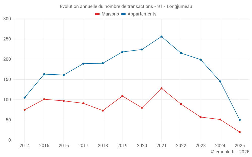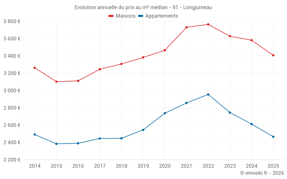 Le prix médian sur les 20 transactions de maisons des 6 derniers mois dans la commune de Longjumeau était de 3 408 € par mètre carré pour une valeur foncière médiane de 325 000 €. Sur cette période 60% des transactions se sont situées entre 2 883 et 3 807 € par mètre carré (du 2ème au 8ème déciles).