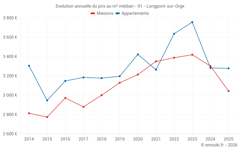 Le prix médian sur les 43 transactions de maisons des 12 derniers mois dans la commune de Longpont-sur-Orge était de 3 152 € par mètre carré pour une valeur foncière médiane de 310 000 €. Sur cette période 60% des transactions se sont situées entre 2 698 et 3 528 € par mètre carré (du 2ème au 8ème déciles).