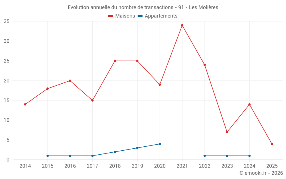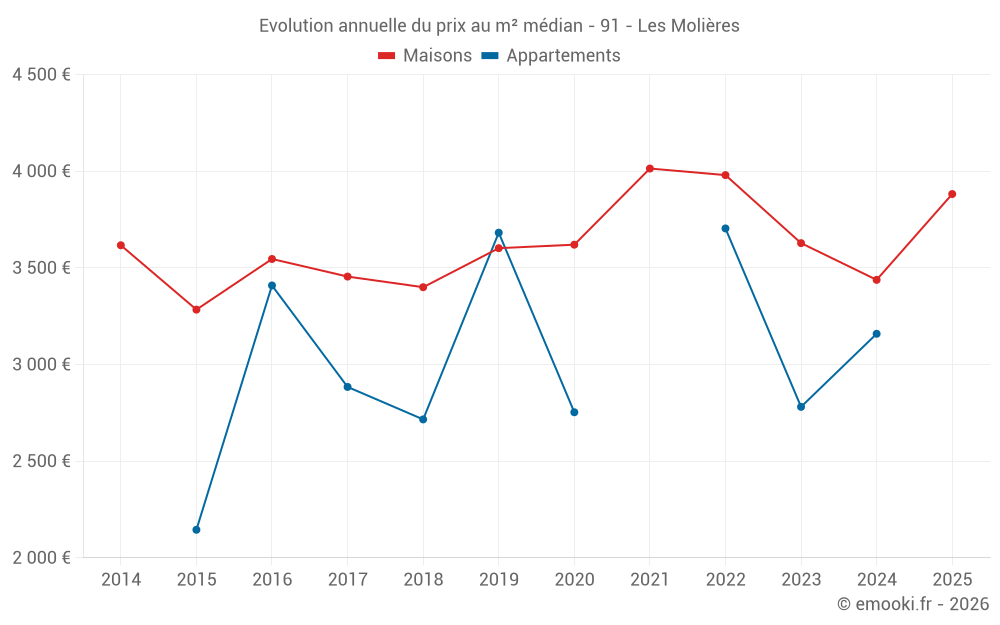 Le prix médian sur les 16 transactions de maisons des 12 derniers mois dans la commune des Molières était de 3 686 € par mètre carré pour une valeur foncière médiane de 329 700 €. Sur cette période 60% des transactions se sont situées entre 3 024 et 4 249 € par mètre carré (du 2ème au 8ème déciles).