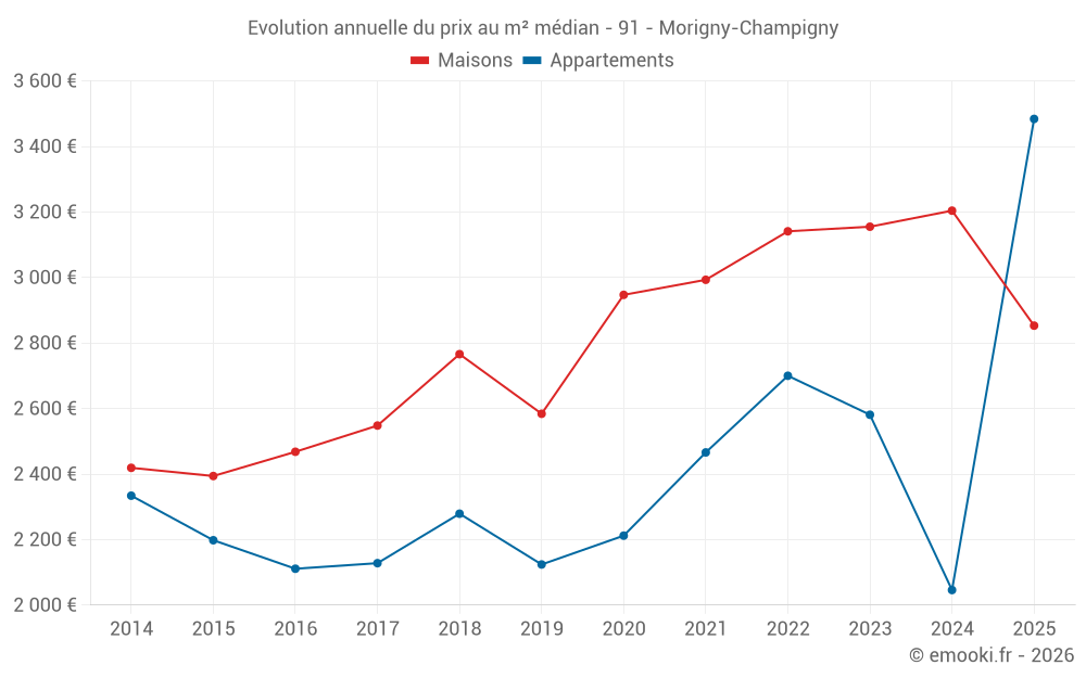 Le prix médian sur les 31 transactions de maisons des 12 derniers mois dans la commune de Morigny-Champigny était de 3 023 € par mètre carré pour une valeur foncière médiane de 280 000 €. Sur cette période 60% des transactions se sont situées entre 2 540 et 3 542 € par mètre carré (du 2ème au 8ème déciles).