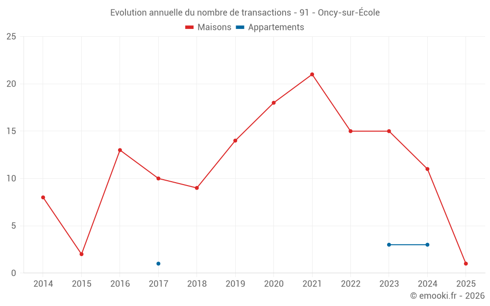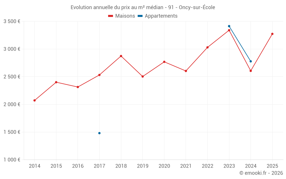 Le prix médian sur les 20 transactions de maisons des 24 derniers mois dans la commune d'Oncy-sur-École était de 3 104 € par mètre carré pour une valeur foncière médiane de 358 000 €. Sur cette période 60% des transactions se sont situées entre 2 202 et 3 607 € par mètre carré (du 2ème au 8ème déciles).