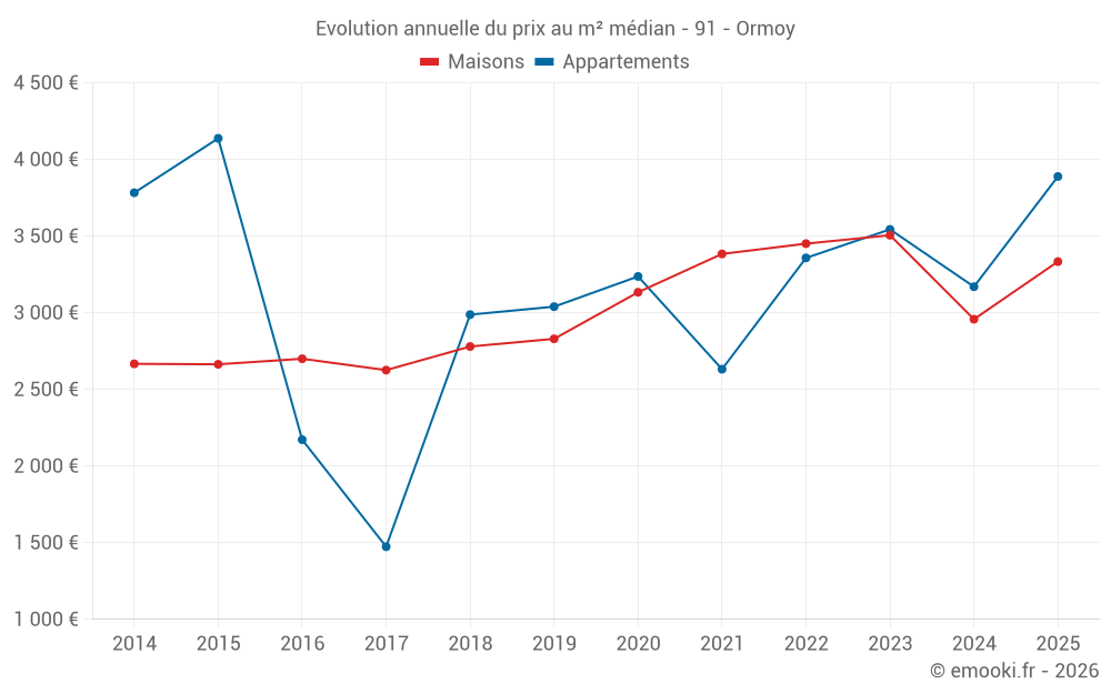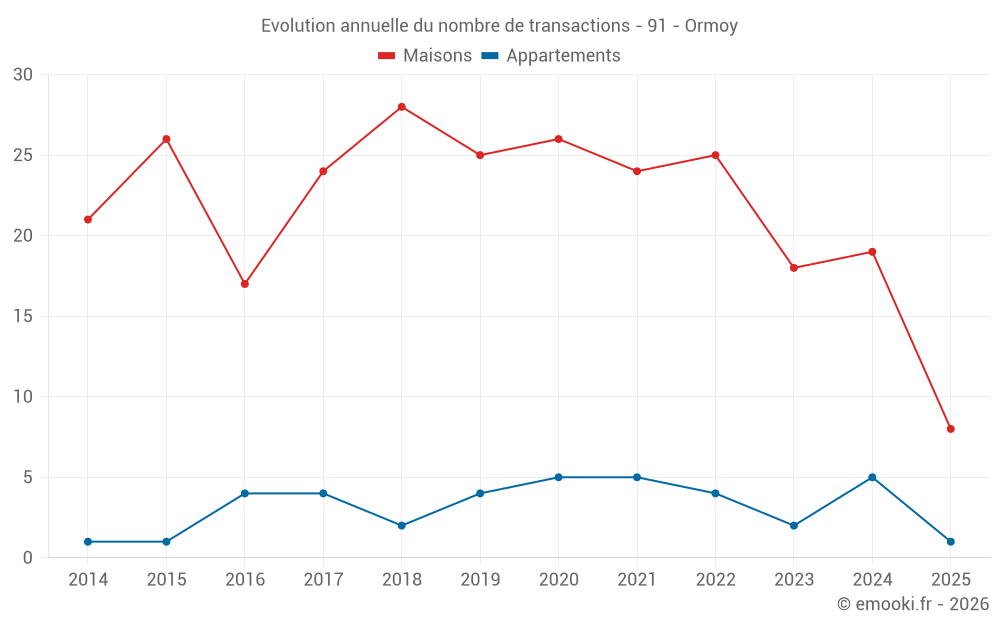 Le prix médian sur les 17 transactions de maisons des 12 derniers mois dans la commune d'Ormoy était de 3 053 € par mètre carré pour une valeur foncière médiane de 302 280 €. Sur cette période 60% des transactions se sont situées entre 2 599 et 3 364 € par mètre carré (du 2ème au 8ème déciles).