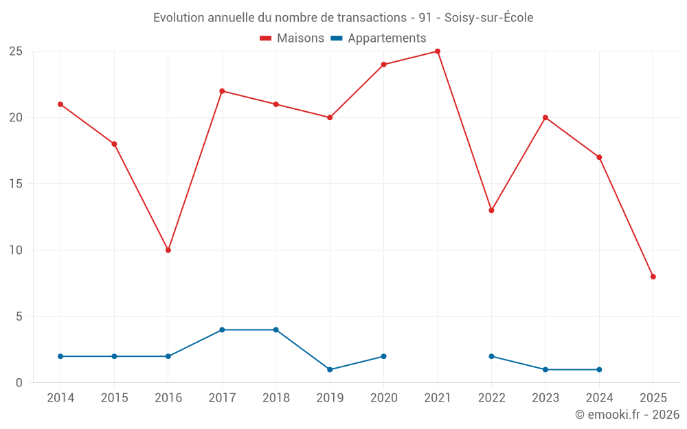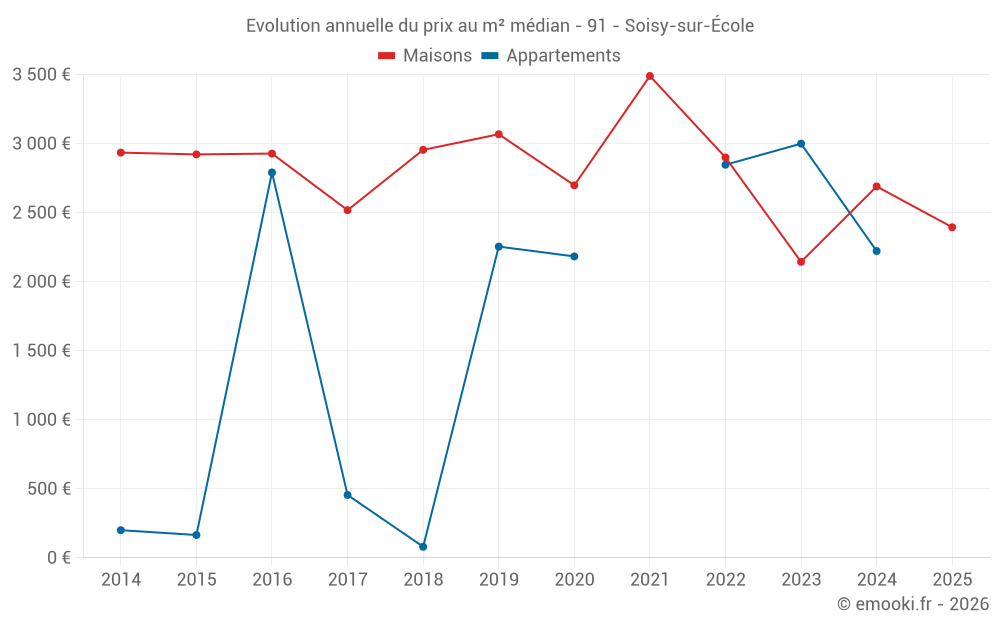 Le prix médian sur les 17 transactions de maisons des 12 derniers mois dans la commune de Soisy-sur-École était de 2 315 € par mètre carré pour une valeur foncière médiane de 279 000 €. Sur cette période 60% des transactions se sont situées entre 2 080 et 3 836 € par mètre carré (du 2ème au 8ème déciles).