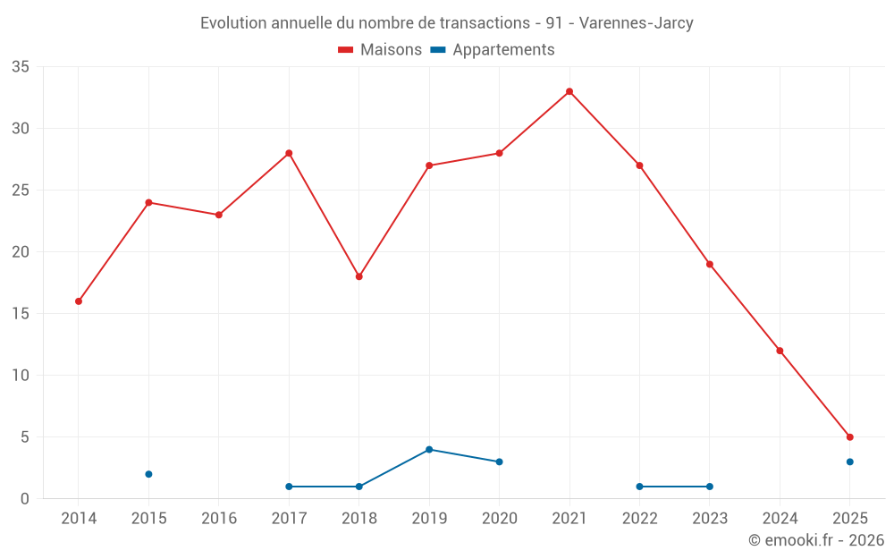 Le prix médian sur les 27 transactions de maisons des 24 derniers mois dans la commune de Varennes-Jarcy était de 3 247 € par mètre carré pour une valeur foncière médiane de 390 000 €. Sur cette période 60% des transactions se sont situées entre 2 298 et 3 736 € par mètre carré (du 2ème au 8ème déciles).