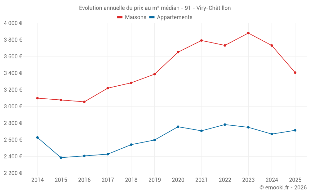 Le prix médian sur les 34 transactions de maisons des 6 derniers mois dans la commune de Viry-Châtillon était de 3 406 € par mètre carré pour une valeur foncière médiane de 300 000 €. Sur cette période 60% des transactions se sont situées entre 2 302 et 3 997 € par mètre carré (du 2ème au 8ème déciles).
