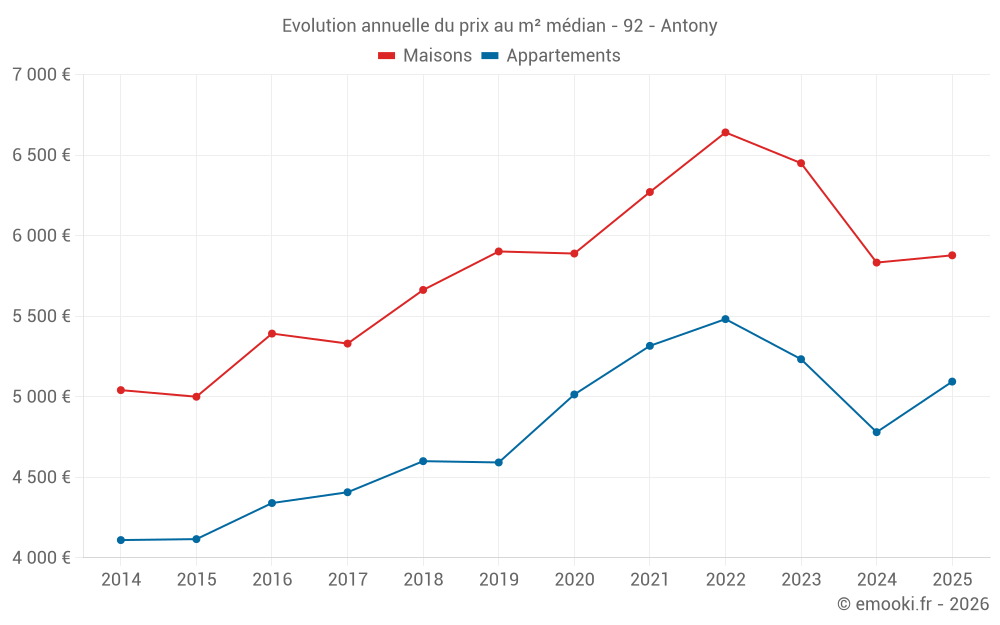 Le prix médian sur les 37 transactions de maisons des 3 derniers mois dans la commune d'Antony était de 6 219 € par mètre carré pour une valeur foncière médiane de 590 000 €. Sur cette période 60% des transactions se sont situées entre 4 979 et 8 411 € par mètre carré (du 2ème au 8ème déciles).