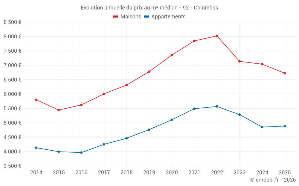 Le prix médian sur les 39 transactions de maisons des 3 derniers mois dans la commune de Colombes était de 6 632 € par mètre carré pour une valeur foncière médiane de 694 700 €. Sur cette période 60% des transactions se sont situées entre 4 975 et 8 450 € par mètre carré (du 2ème au 8ème déciles).