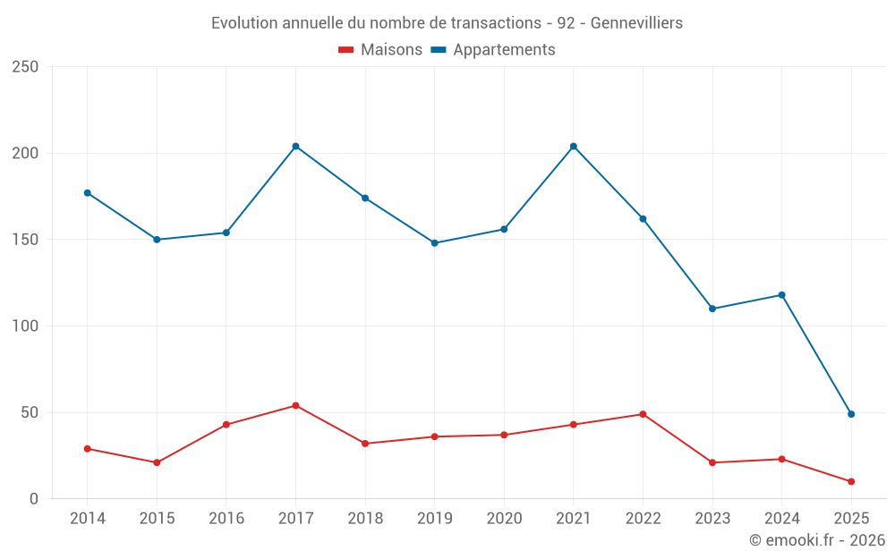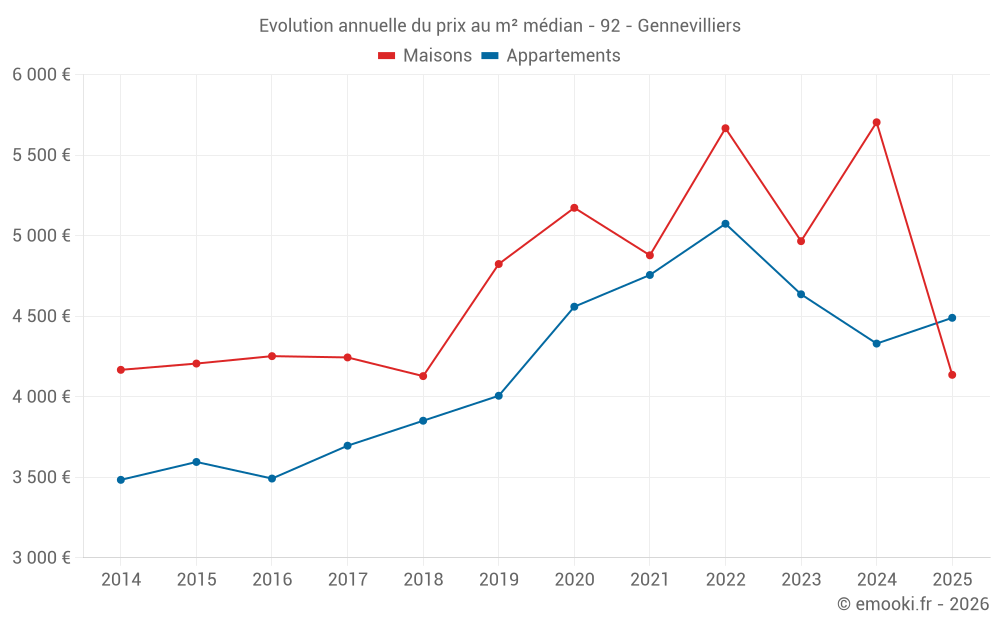 Le prix médian sur les 23 transactions de maisons des 12 derniers mois dans la commune de Gennevilliers était de 5 862 € par mètre carré pour une valeur foncière médiane de 400 000 €. Sur cette période 60% des transactions se sont situées entre 3 845 et 6 626 € par mètre carré (du 2ème au 8ème déciles).