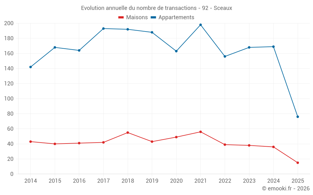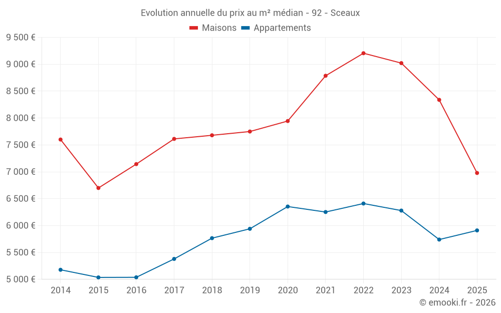 Le prix médian sur les 31 transactions de maisons des 12 derniers mois dans la commune de Sceaux était de 7 638 € par mètre carré pour une valeur foncière médiane de 1 017 000 €. Sur cette période 60% des transactions se sont situées entre 5 941 et 9 139 € par mètre carré (du 2ème au 8ème déciles).