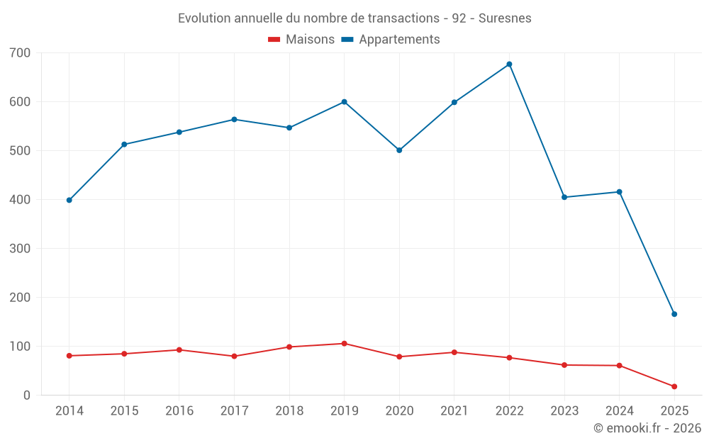 Le prix médian sur les 18 transactions de maisons des 6 derniers mois dans la commune de Suresnes était de 8 626 € par mètre carré pour une valeur foncière médiane de 865 000 €. Sur cette période 60% des transactions se sont situées entre 7 185 et 10 010 € par mètre carré (du 2ème au 8ème déciles).