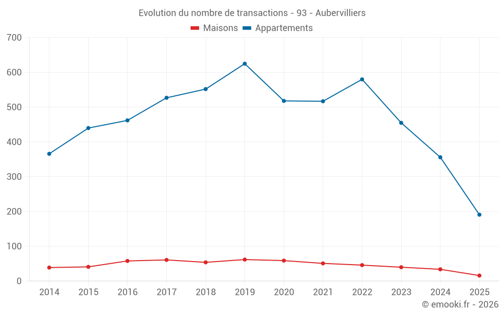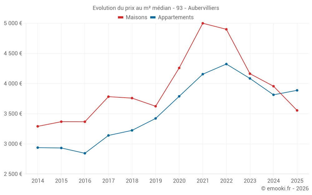 Le prix médian sur les 28 transactions de maisons des 12 derniers mois dans la commune d'Aubervilliers était de 3 840 € par mètre carré pour une valeur foncière médiane de 320 000 €. Sur cette période 60% des transactions se sont situées entre 2 863 et 5 016 € par mètre carré (du 2ème au 8ème déciles).