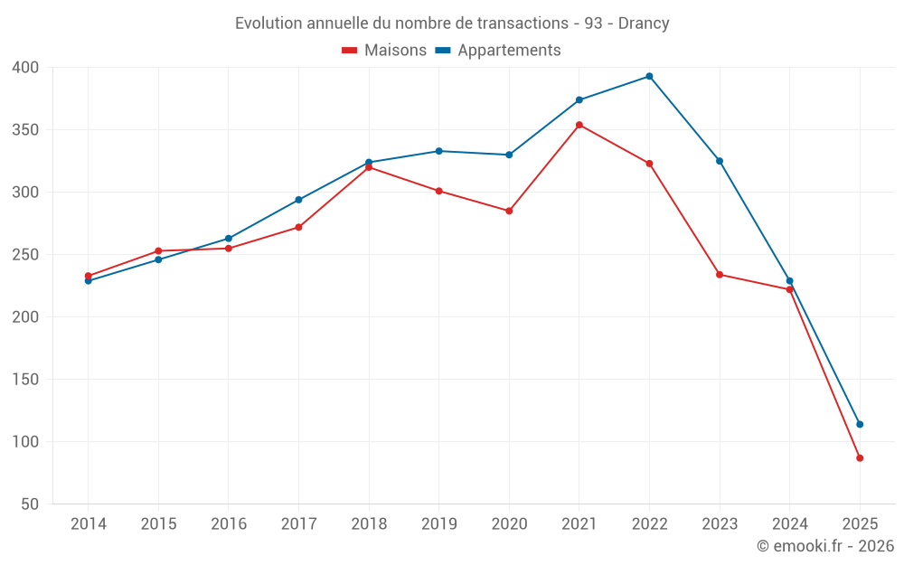 Le prix médian sur les 43 transactions d'appartements des 3 derniers mois dans la commune de Drancy était de 2 787 € par mètre carré pour une valeur foncière médiane de 131 000 €. Sur cette période 60% des transactions se sont situées entre 2 290 et 4 026 € par mètre carré (du 2ème au 8ème déciles).
