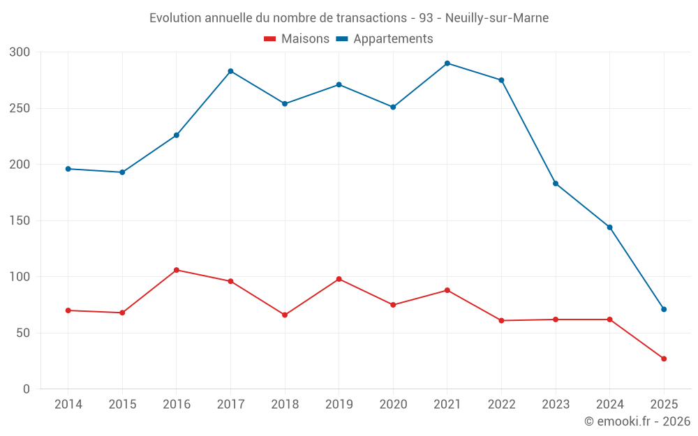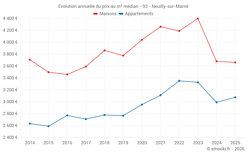 Le prix médian sur les 27 transactions de maisons des 6 derniers mois dans la commune de Neuilly-sur-Marne était de 3 660 € par mètre carré pour une valeur foncière médiane de 320 000 €. Sur cette période 60% des transactions se sont situées entre 3 028 et 4 273 € par mètre carré (du 2ème au 8ème déciles).