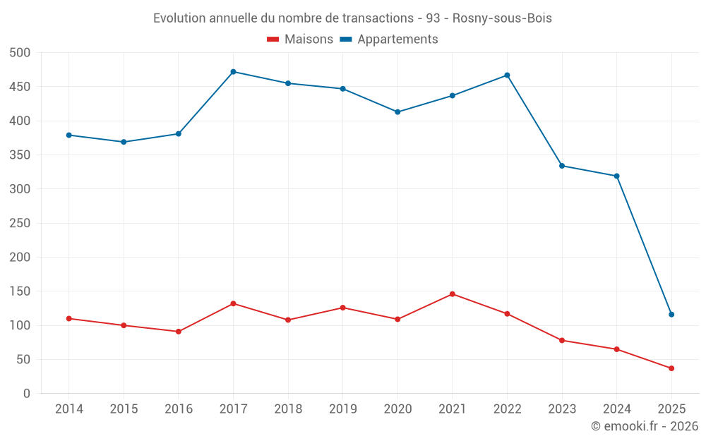 Le prix médian sur les 37 transactions de maisons des 6 derniers mois dans la commune de Rosny-sous-Bois était de 4 600 € par mètre carré pour une valeur foncière médiane de 375 000 €. Sur cette période 60% des transactions se sont situées entre 3 473 et 6 451 € par mètre carré (du 2ème au 8ème déciles).