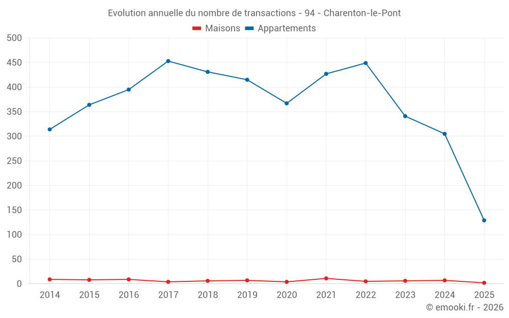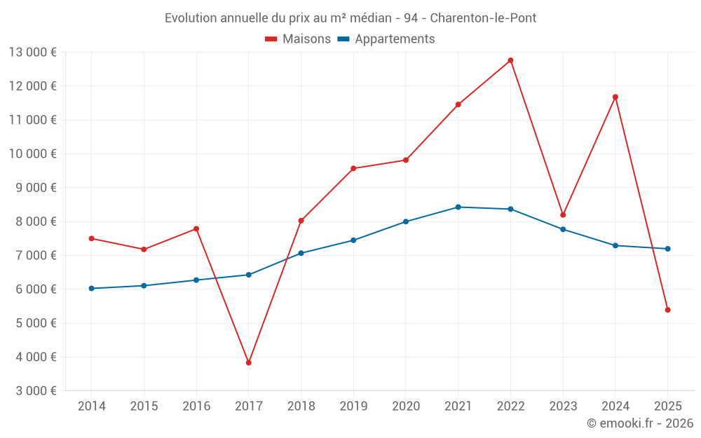 Le prix médian sur les 51 transactions d'appartements des 3 derniers mois dans la commune de Charenton-le-Pont était de 7 160 € par mètre carré pour une valeur foncière médiane de 365 000 €. Sur cette période 60% des transactions se sont situées entre 5 732 et 8 364 € par mètre carré (du 2ème au 8ème déciles).