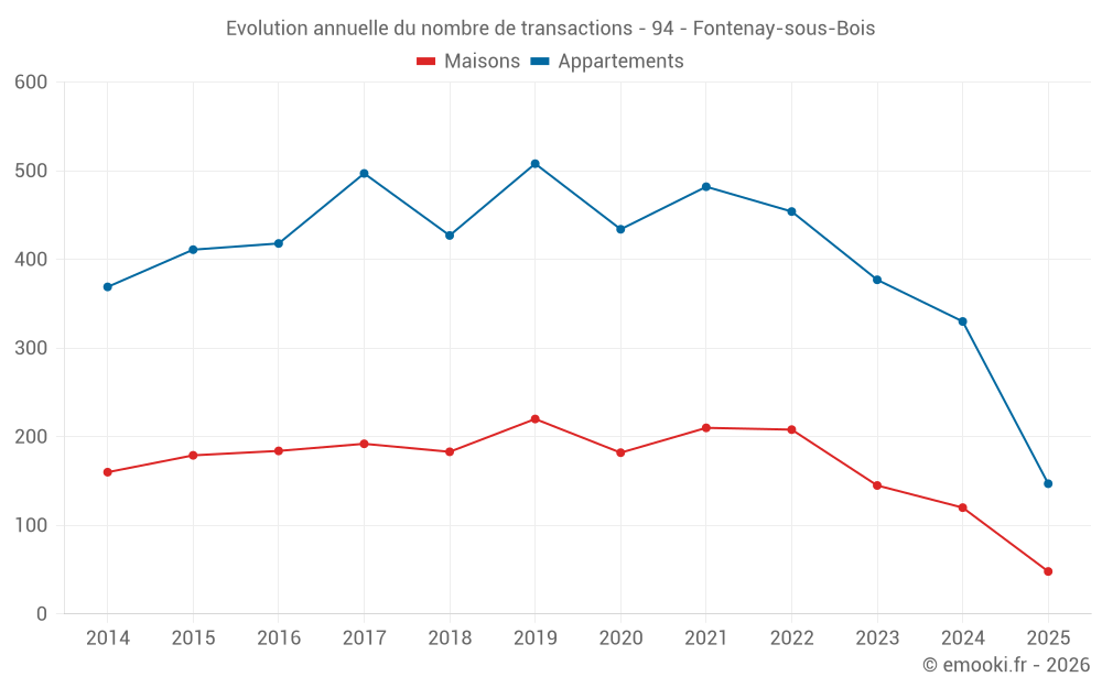 Le prix médian sur les 51 transactions d'appartements des 3 derniers mois dans la commune de Fontenay-sous-Bois était de 5 651 € par mètre carré pour une valeur foncière médiane de 280 000 €. Sur cette période 60% des transactions se sont situées entre 4 296 et 6 742 € par mètre carré (du 2ème au 8ème déciles).