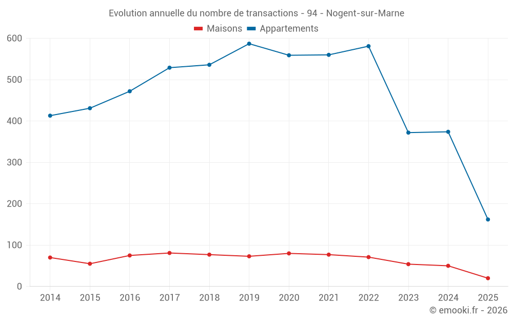 Le prix médian sur les 20 transactions de maisons des 6 derniers mois dans la commune de Nogent-sur-Marne était de 8 109 € par mètre carré pour une valeur foncière médiane de 726 576 €. Sur cette période 60% des transactions se sont situées entre 5 628 et 9 684 € par mètre carré (du 2ème au 8ème déciles).