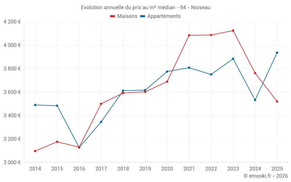 Le prix médian sur les 24 transactions de maisons des 12 derniers mois dans la commune de Noiseau était de 3 746 € par mètre carré pour une valeur foncière médiane de 364 750 €. Sur cette période 60% des transactions se sont situées entre 3 278 et 5 399 € par mètre carré (du 2ème au 8ème déciles).