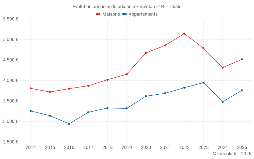 Le prix médian sur les 23 transactions de maisons des 6 derniers mois dans la commune de Thiais était de 4 516 € par mètre carré pour une valeur foncière médiane de 470 000 €. Sur cette période 60% des transactions se sont situées entre 4 036 et 5 259 € par mètre carré (du 2ème au 8ème déciles).