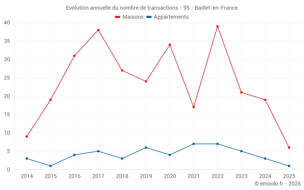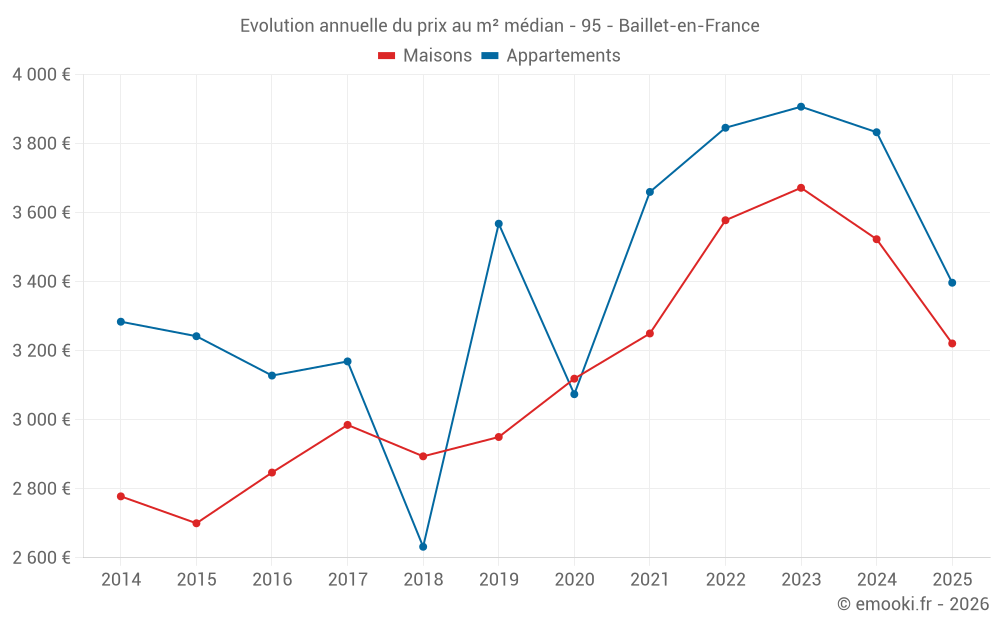 Le prix médian sur les 17 transactions de maisons des 12 derniers mois dans la commune de Baillet-en-France était de 3 376 € par mètre carré pour une valeur foncière médiane de 325 150 €. Sur cette période 60% des transactions se sont situées entre 3 140 et 3 713 € par mètre carré (du 2ème au 8ème déciles).