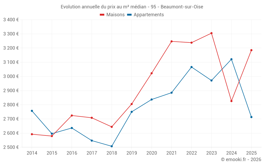 Le prix médian sur les 19 transactions de maisons des 6 derniers mois dans la commune de Beaumont-sur-Oise était de 3 185 € par mètre carré pour une valeur foncière médiane de 282 000 €. Sur cette période 60% des transactions se sont situées entre 2 601 et 3 985 € par mètre carré (du 2ème au 8ème déciles).