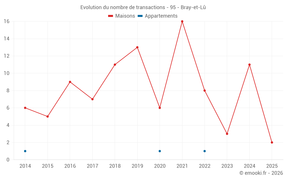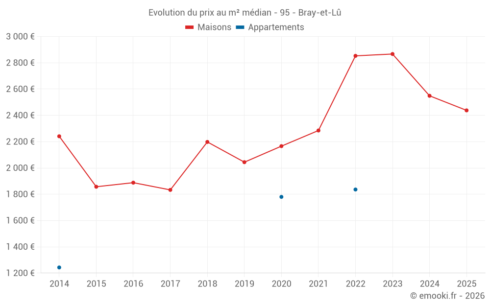 Le prix médian sur les 16 transactions de maisons des 24 derniers mois dans la commune de Bray-et-Lû était de 2 560 € par mètre carré pour une valeur foncière médiane de 223 250 €. Sur cette période 60% des transactions se sont situées entre 1 887 et 3 083 € par mètre carré (du 2ème au 8ème déciles).
