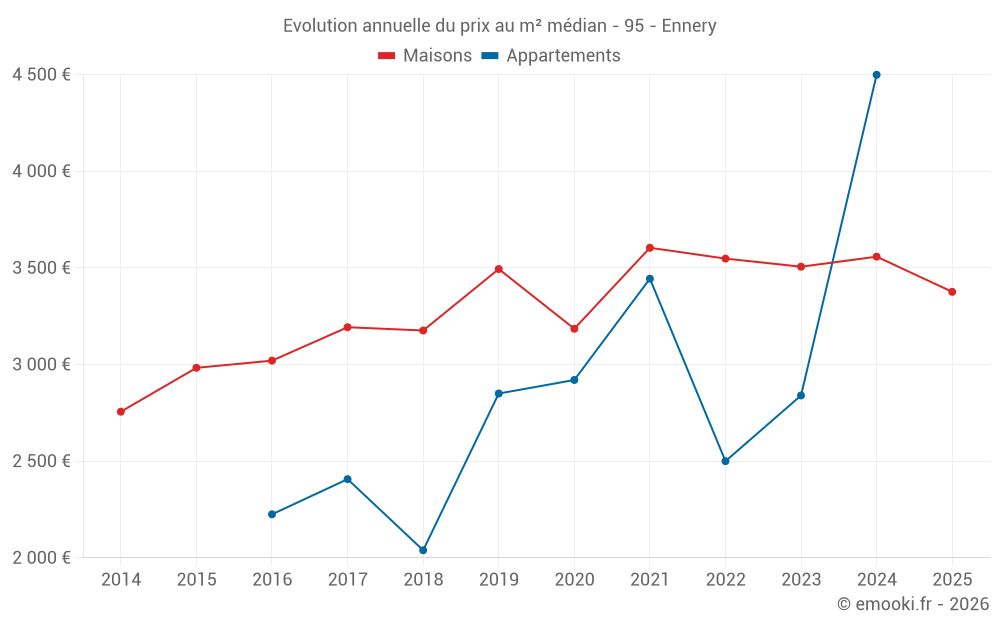 Le prix médian sur les 23 transactions de maisons des 12 derniers mois dans la commune d'Ennery était de 3 440 € par mètre carré pour une valeur foncière médiane de 377 500 €. Sur cette période 60% des transactions se sont situées entre 2 791 et 3 950 € par mètre carré (du 2ème au 8ème déciles).