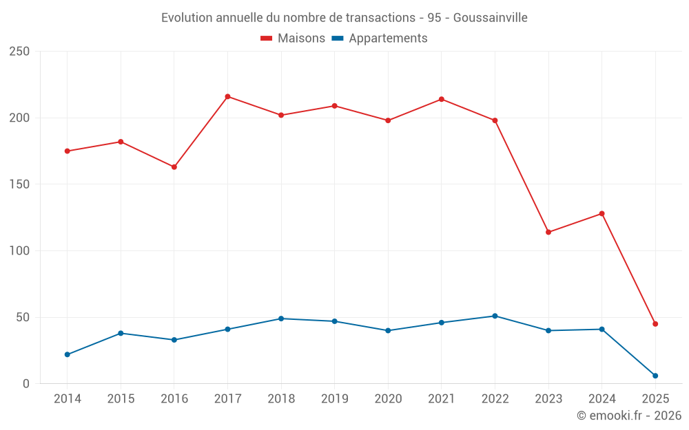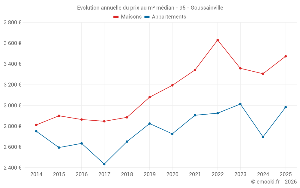 Le prix médian sur les 29 transactions d'appartements des 12 derniers mois dans la commune de Goussainville était de 2 814 € par mètre carré pour une valeur foncière médiane de 120 000 €. Sur cette période 60% des transactions se sont situées entre 2 281 et 3 405 € par mètre carré (du 2ème au 8ème déciles).