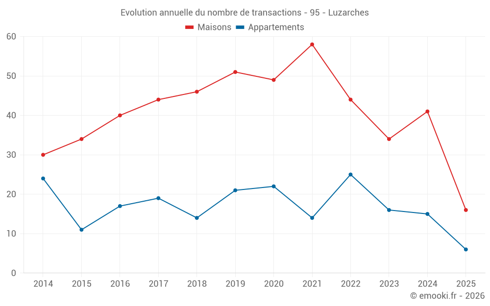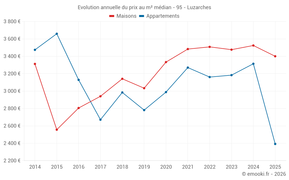 Le prix médian sur les 41 transactions de maisons des 12 derniers mois dans la commune de Luzarches était de 3 443 € par mètre carré pour une valeur foncière médiane de 349 000 €. Sur cette période 60% des transactions se sont situées entre 3 122 et 3 909 € par mètre carré (du 2ème au 8ème déciles).