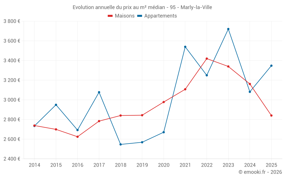 Le prix médian sur les 49 transactions de maisons des 12 derniers mois dans la commune de Marly-la-Ville était de 2 990 € par mètre carré pour une valeur foncière médiane de 285 000 €. Sur cette période 60% des transactions se sont situées entre 2 469 et 3 429 € par mètre carré (du 2ème au 8ème déciles).