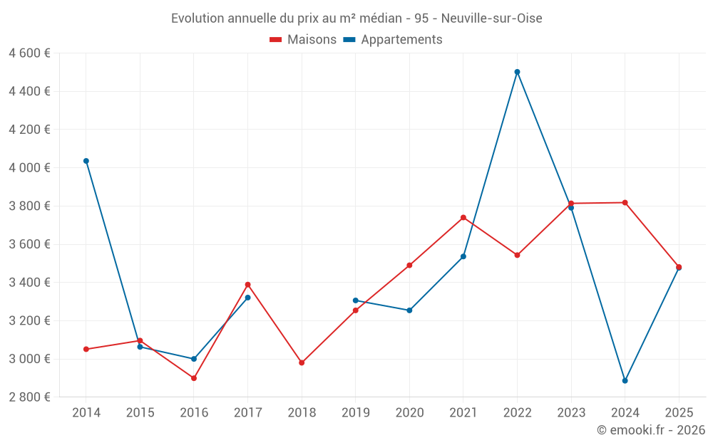 Le prix médian sur les 21 transactions de maisons des 24 derniers mois dans la commune de Neuville-sur-Oise était de 3 481 € par mètre carré pour une valeur foncière médiane de 448 000 €. Sur cette période 60% des transactions se sont situées entre 3 086 et 4 075 € par mètre carré (du 2ème au 8ème déciles).