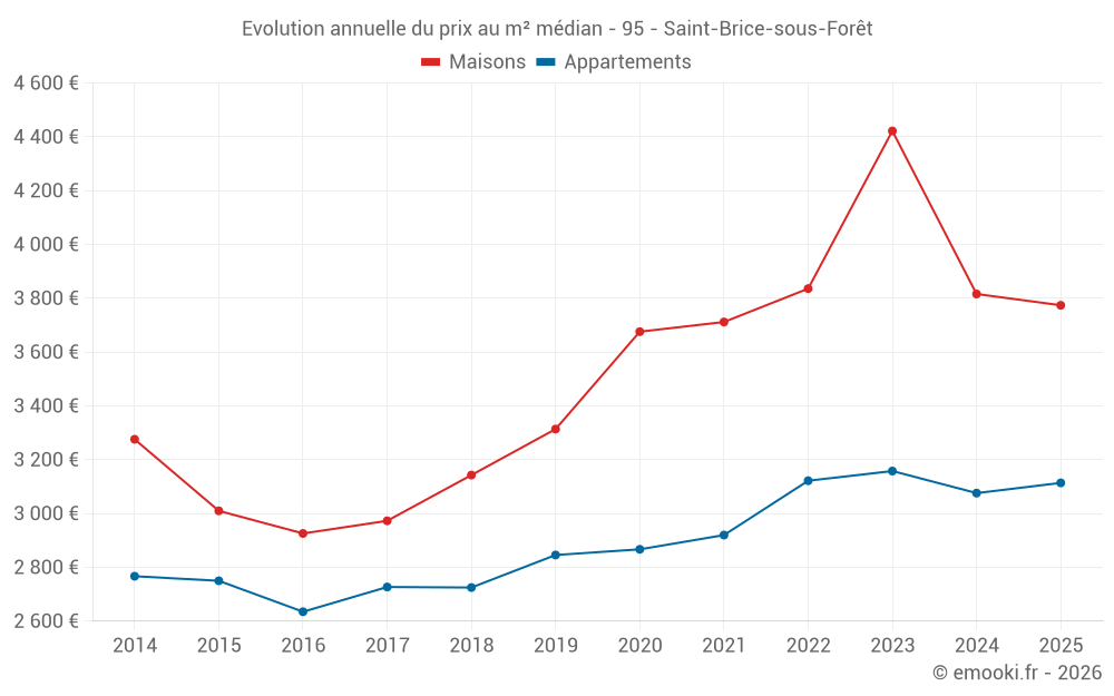 Le prix médian sur les 40 transactions de maisons des 12 derniers mois dans la commune de Saint-Brice-sous-Forêt était de 3 766 € par mètre carré pour une valeur foncière médiane de 355 750 €. Sur cette période 60% des transactions se sont situées entre 3 176 et 4 800 € par mètre carré (du 2ème au 8ème déciles).
