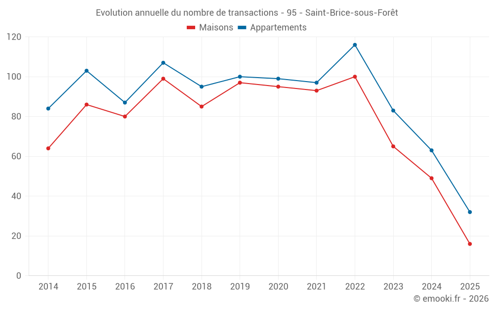 Le prix médian sur les 32 transactions d'appartements des 6 derniers mois dans la commune de Saint-Brice-sous-Forêt était de 3 114 € par mètre carré pour une valeur foncière médiane de 180 000 €. Sur cette période 60% des transactions se sont situées entre 2 430 et 3 823 € par mètre carré (du 2ème au 8ème déciles).
