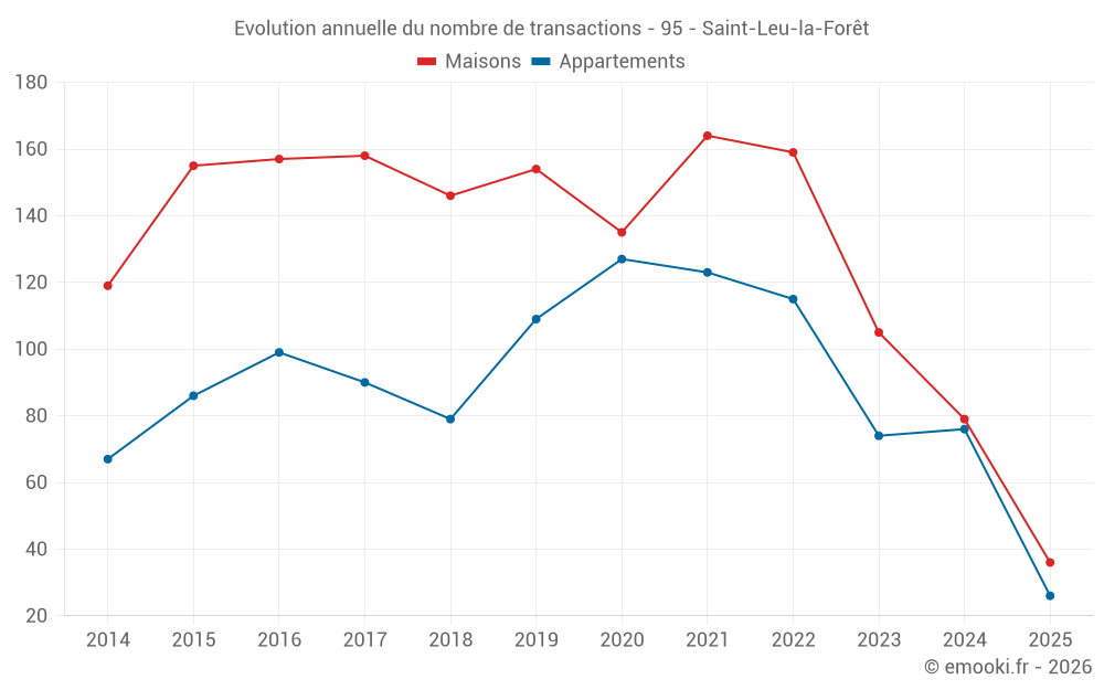Le prix médian sur les 36 transactions de maisons des 6 derniers mois dans la commune de Saint-Leu-la-Forêt était de 3 922 € par mètre carré pour une valeur foncière médiane de 356 500 €. Sur cette période 60% des transactions se sont situées entre 3 256 et 5 147 € par mètre carré (du 2ème au 8ème déciles).